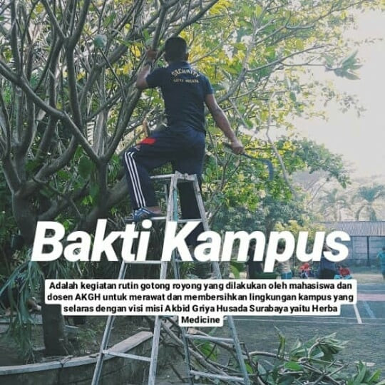BAKTI KAMPUS adalah kegiatan rutin gotong royong yang dilakukan oleh mahasiswa, dosen, beserta karyawan STIKES Griya Husada Surabaya untuk merawat dan membersihkan lingkungan kampus yang selaras dengan VISI dan MISI STIKES Griya Husada Surabaya yaitu Herba Medicine